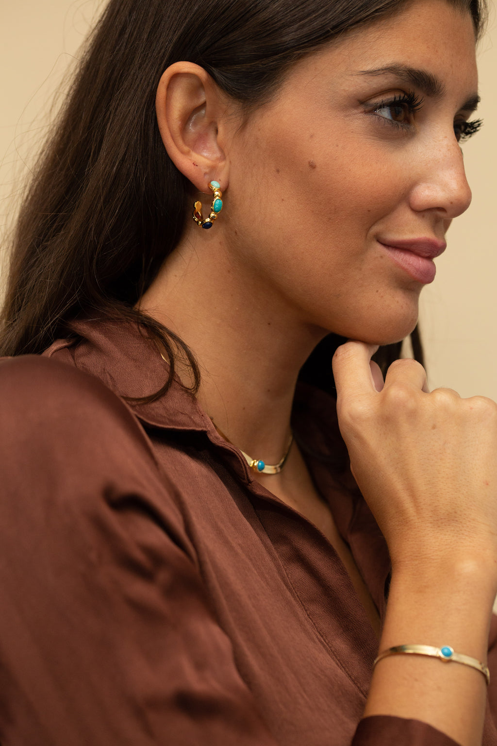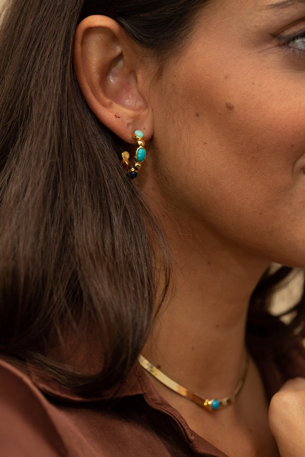 Eleganti orecchini in bronzo placcato oro giallo 18 kt, impreziositi da pietre azzurre e multicolor alternate che regalano luminosità e vivacità al look.