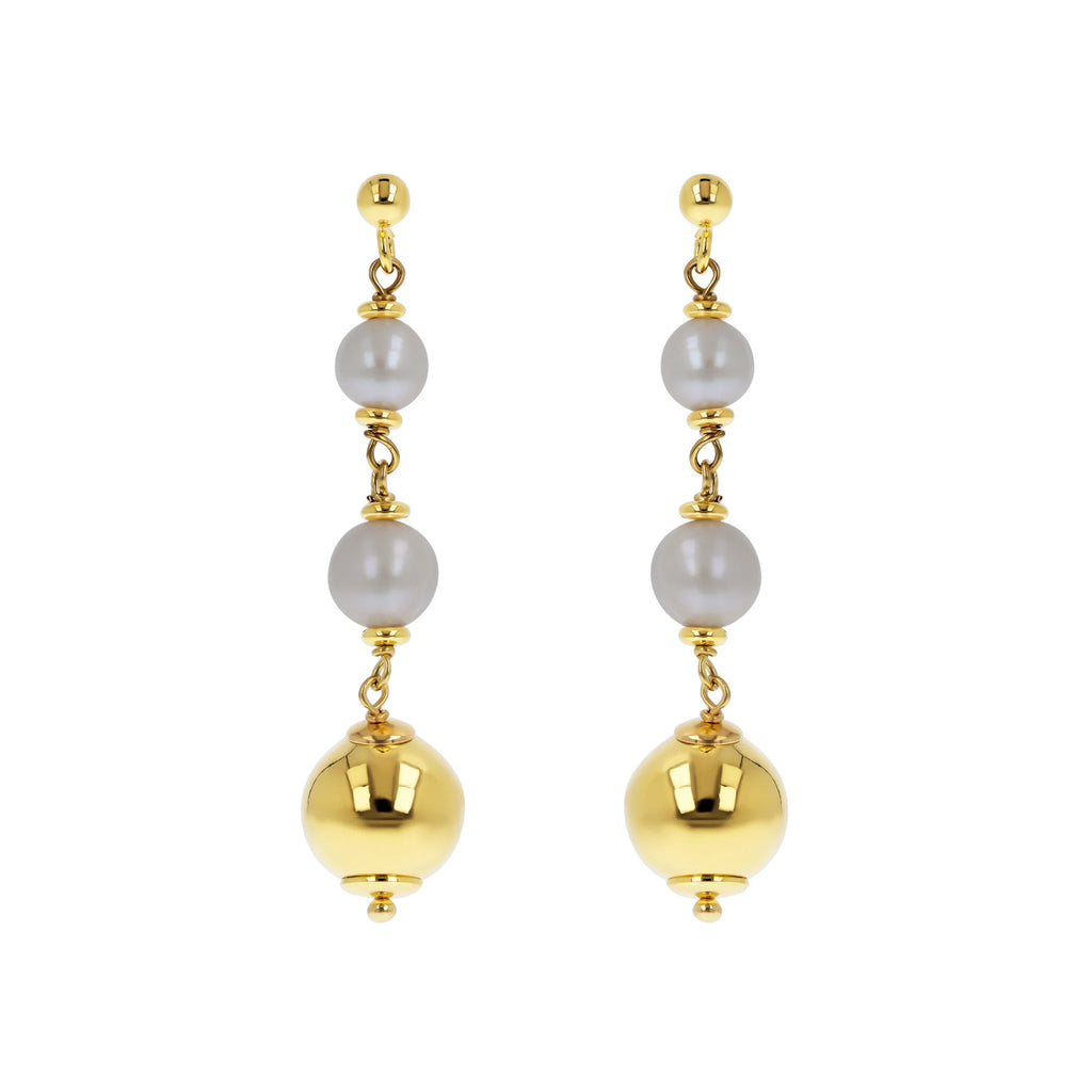 Orecchini pendenti raffinati e luminosi, composti da tre pendenti armoniosi: una vera perla di fiume centrale, autentica e naturale, accompagnata da palline dorate piene che donano equilibrio, movimento e luce al design.