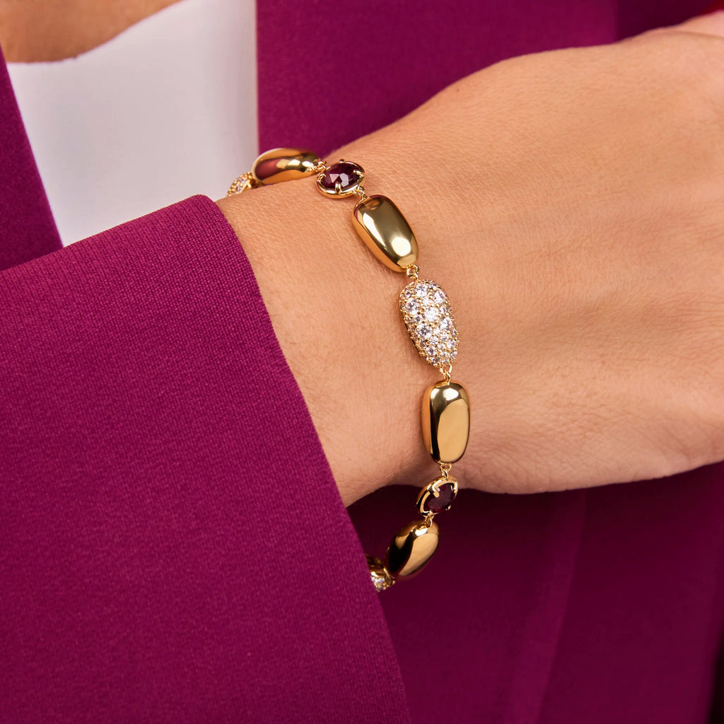 Un gioiello elegante e luminoso che racchiude tutta la magia del colore — il Bracciale con pietre rubino o turchesi alterna elementi ovali dorati a rettangoli tempestati di zirconi, creando un equilibrio perfetto tra luce e vivacità.