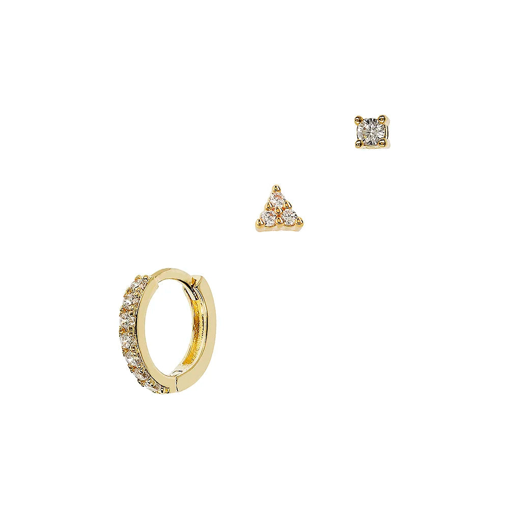 Il Set di 3 Mini Orecchini è l’ideale per chi ama i gioielli piccoli ma speciali e desidera riempire i buchi sull’orecchio con eleganza e stile. Ogni set include 3 orecchini micro, perfetti per essere indossati su più buchi o per creare un look originale e sofisticato. Placcati in Oro Giallo 18 kt, questi orecchini sono pensati per essere facilmente abbinati tra loro, con un design delicato ma luminoso. Set composto da: Cerchietto piccolo con zirconi per un tocco di brillantezza Punto luce mini da indossare al lobo, ideale per illuminare il viso Triangolino punto luce mini, perfetto per aggiungere un dettaglio geometrico e moderno