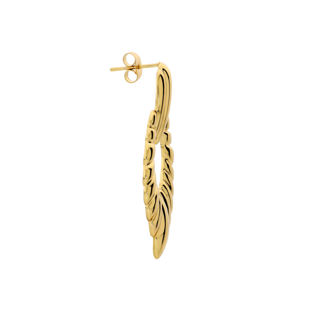 Orecchini dal design ad anello lavorato, caratterizzati da una texture scanalata e voluminosa che riflette la luce con grande intensità.