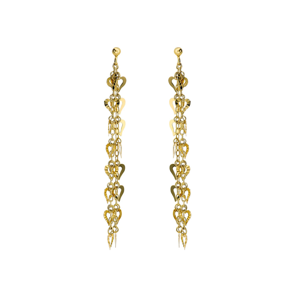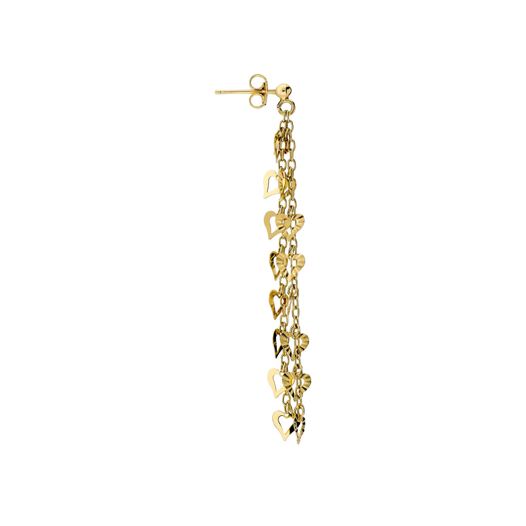 Gli orecchini Cuori in Luce sono caratterizzati da due file pendenti di cuori forati, che creano un effetto movimento delicato e luminoso, perfettamente coordinato con la collana abbinata.