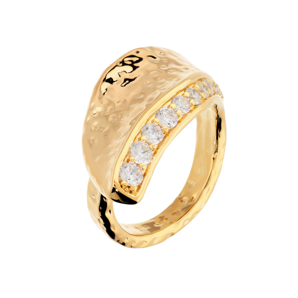 Realizzato su base in bronzo bagnato in oro giallo 18 kt, presenta una superficie martellata che riflette la luce con delicate sfumature, donando al gioiello un effetto luminoso e sofisticato.
