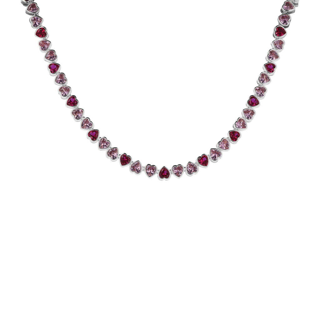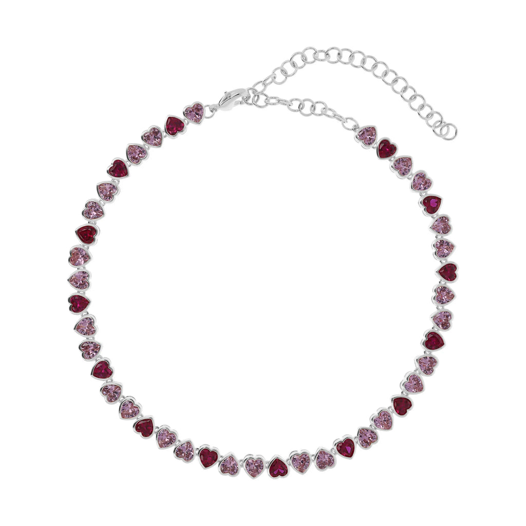Una collana choker scenografica e luminosa, composta da una fila di cuori interamente ricoperti di zirconi preziosi nei toni rosa e fucsia, che creano un effetto brillante, intenso e ultra femminile.