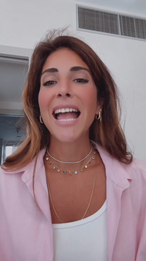 Un gioiello luminoso che dona un tocco di colore unico al tuo stile in ogni stagione! Realizzata in base bronzo placcato oro giallo 18 kt, è impreziosita da piccoli ciondoli a forma di cerchio con pietre multicolor. Le sfumature vivaci e brillanti si alternano armoniosamente, creando un effetto elegante e allegro che illumina il viso in ogni occasione – dall’outfit quotidiano a quello più speciale.