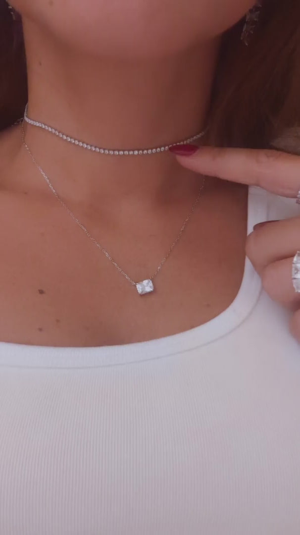 Un gioiello raffinato e luminoso: catena sottile e leggera in argento 925 placcato oro bianco 8 kt, impreziosita da una brillante pietra taglio baguette rettangolare che cattura la luce in ogni movimento. Perfetta da sola per un look elegante e minimal, oppure abbinata ai nuovi orecchini Baguette per un coordinato moderno e sofisticato.