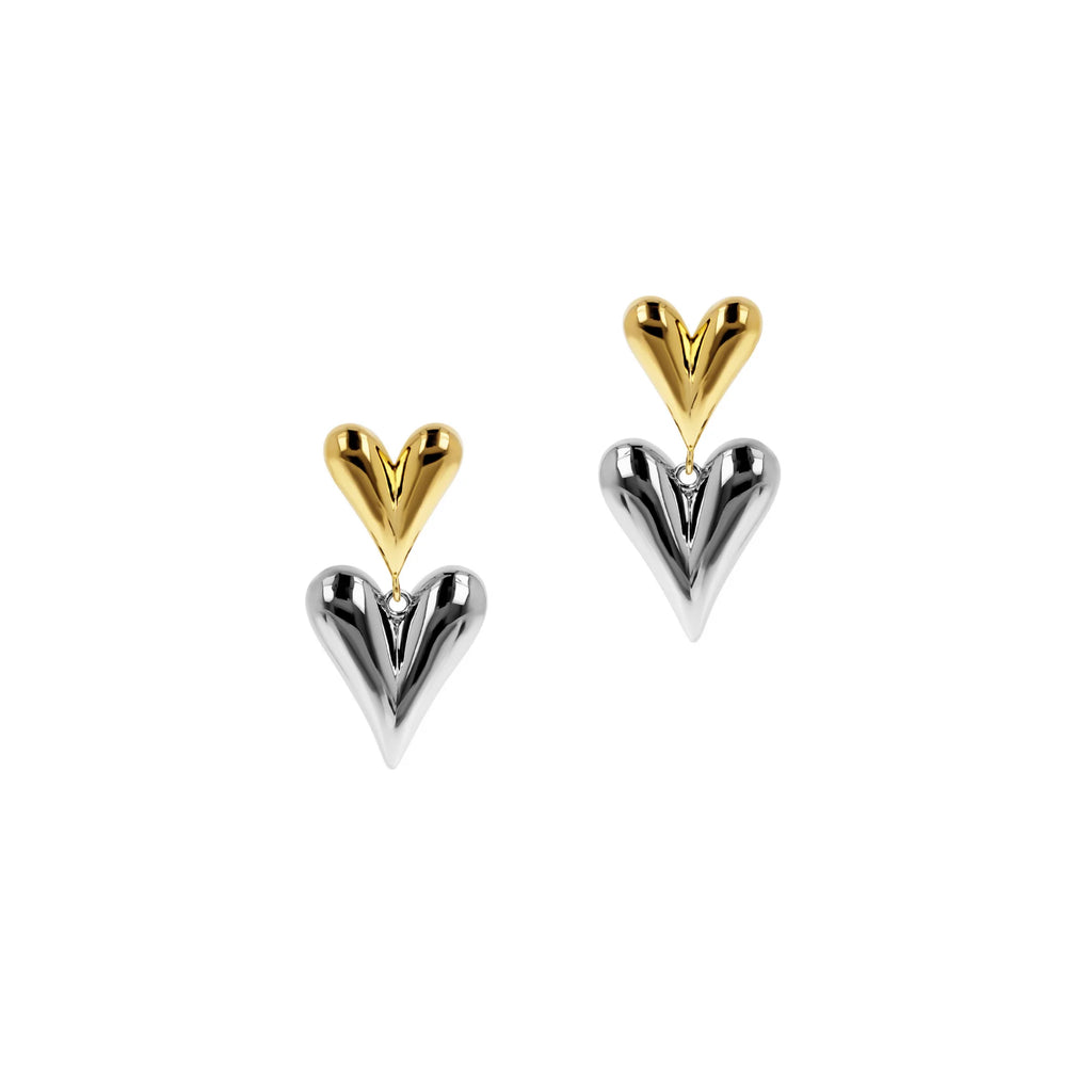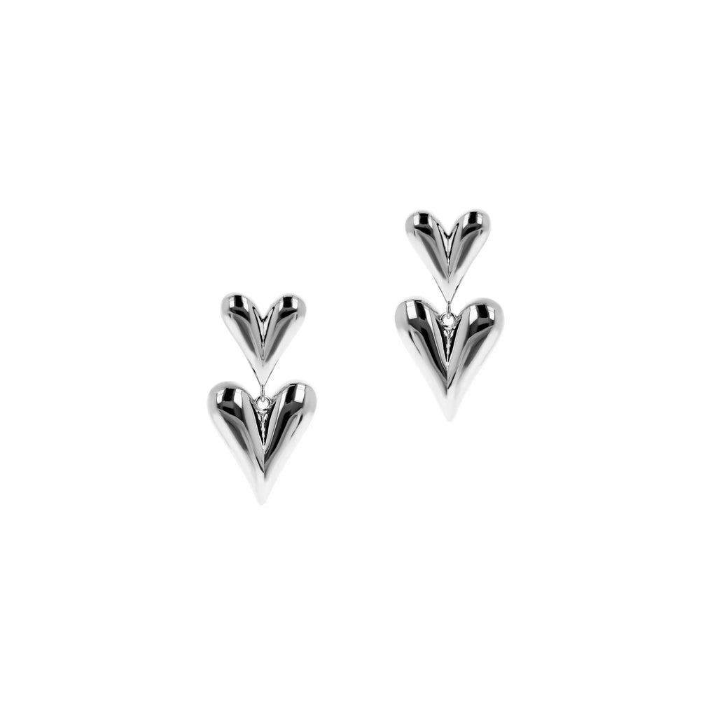 Orecchini pendenti dal design raffinato e contemporaneo, con doppio cuore: uno superiore più piccolo e uno inferiore più grande, per un effetto elegante e scenografico.