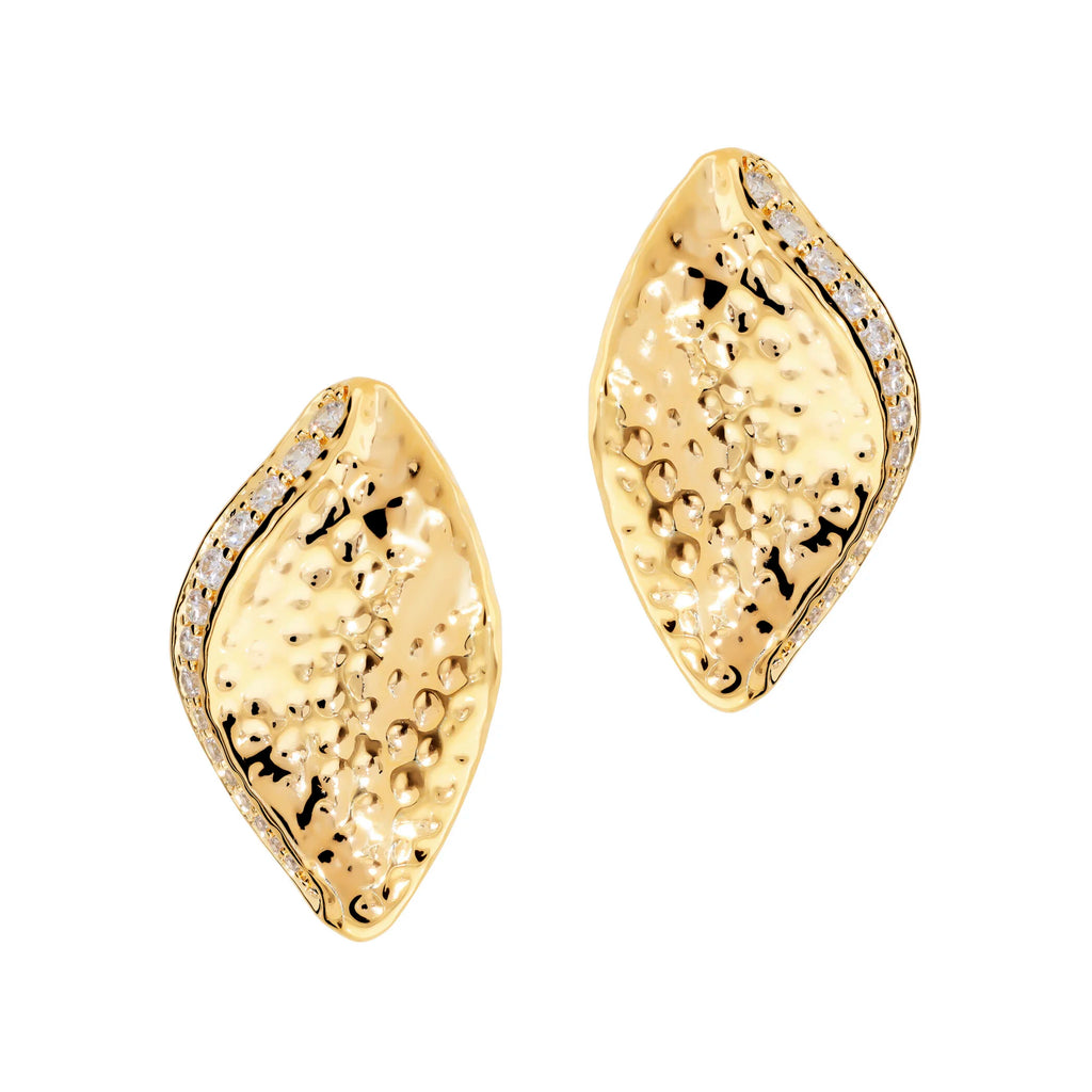 Realizzati su base in bronzo placcato oro giallo 18 kt, presentano una forma a foglia leggermente curva impreziosita da una fila di zirconi brillanti, che cattura la luce ad ogni movimento.