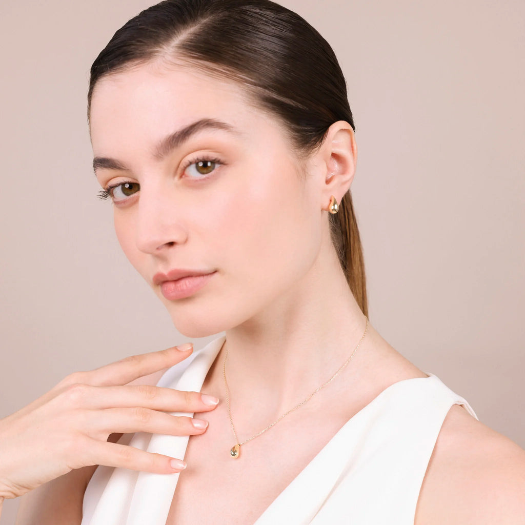 Orecchini a lobo in Oro 375/1000 dal design a goccia ( mm). Finitura lucida. Chiusura a perno e farfalla. Lunghezza x cm.