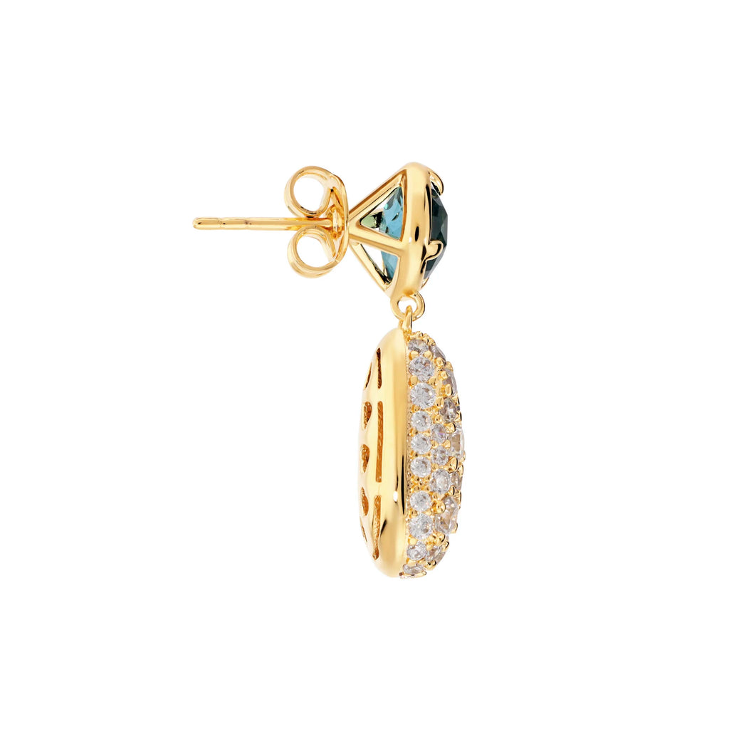 Realizzati su base in bronzo bagnato in oro giallo 18 kt, presentano una pietra centrale brillante da cui scende un pendente rettangolare tempestato di zirconi, che cattura la luce ad ogni movimento.