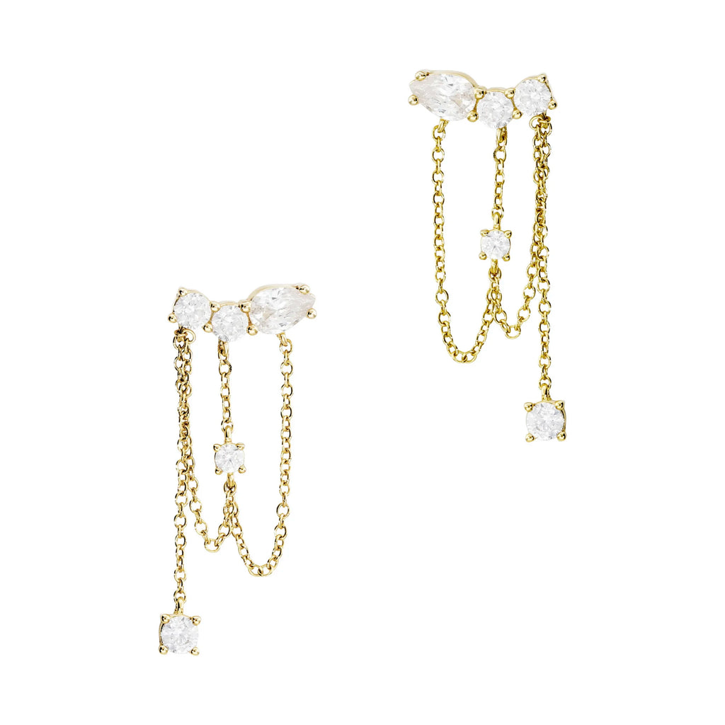 Tre zirconi preziosi brillano sul lobo, mentre da dietro la farfallina scendono sottili catenine dorate arricchite da due piccoli zirconi pendenti, che si muovono delicatamente ad ogni passo.
